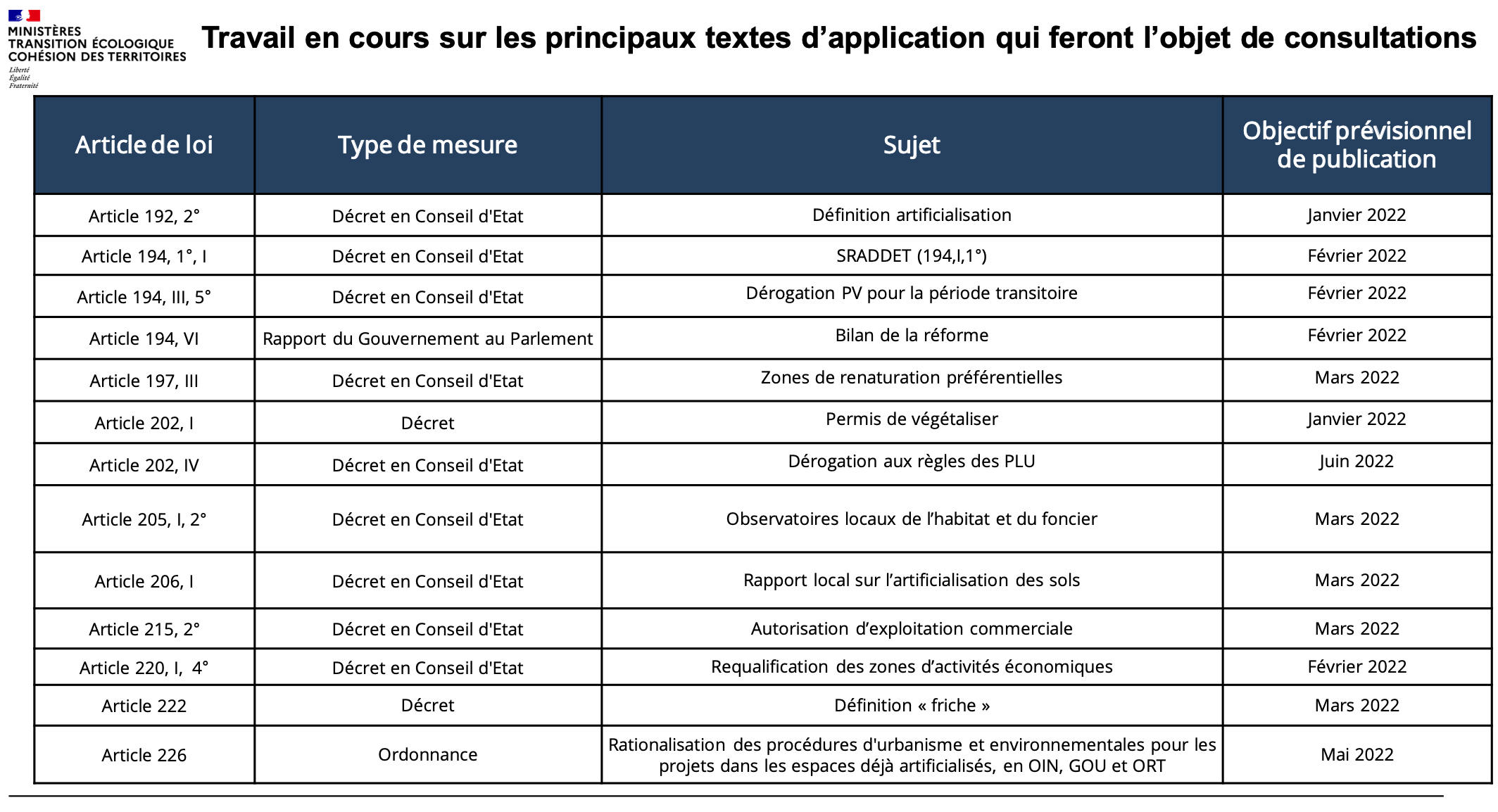 - la production d’un rapport triennal par le maire ou le président d’intercommunalité sur l’artificialisation des sols (L. 2231-1 CGCT). »Un décret en Conseil d’Etat détermine les conditions d’application du présent article. Il précise notamment les indicateurs et les données qui doivent figurer dans le rapport ainsi que les conditions dans lesquelles l’Etat met à la disposition des collectivités concernées les données de l’observatoire de l’artificialisation. » calendrier prévisionnel pour mars 2022