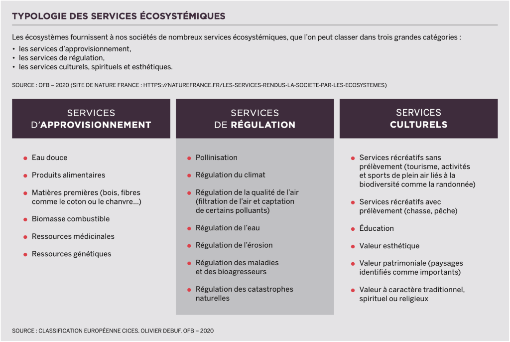 En reprenant la typologie des services écosystémiques (présentée ci-dessus), les retours d’expériences proposés s’organisent en 3 thèmes :