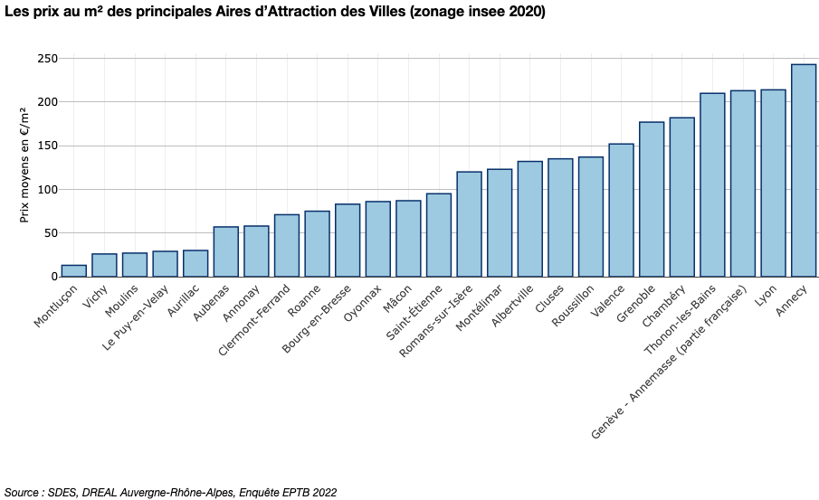Les prix moyens autour des aires d’Annecy et Lyon sont par exemple 2 fois supérieurs à ceux autour de Saint-Étienne ou Albertville.