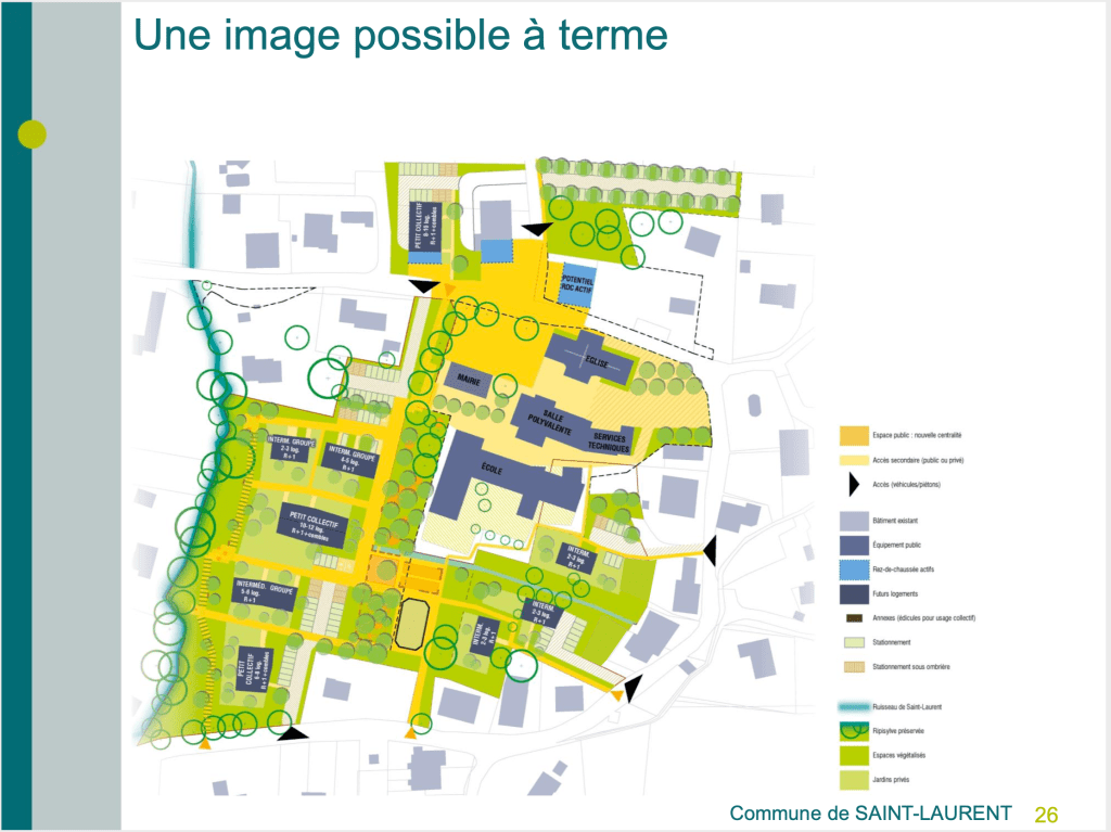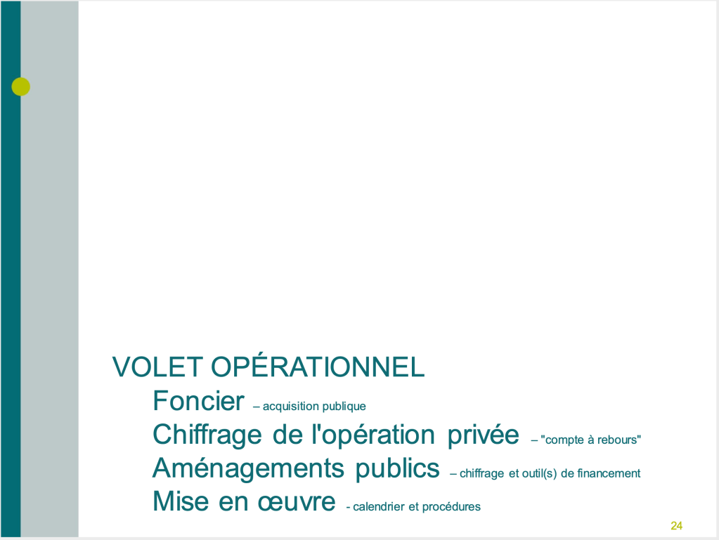 - calendrier incluant les éléments règlementaires (modification PLU), le foncier, l’éventuel outil de financement et les travaux de la commune pour les aménagements publics.