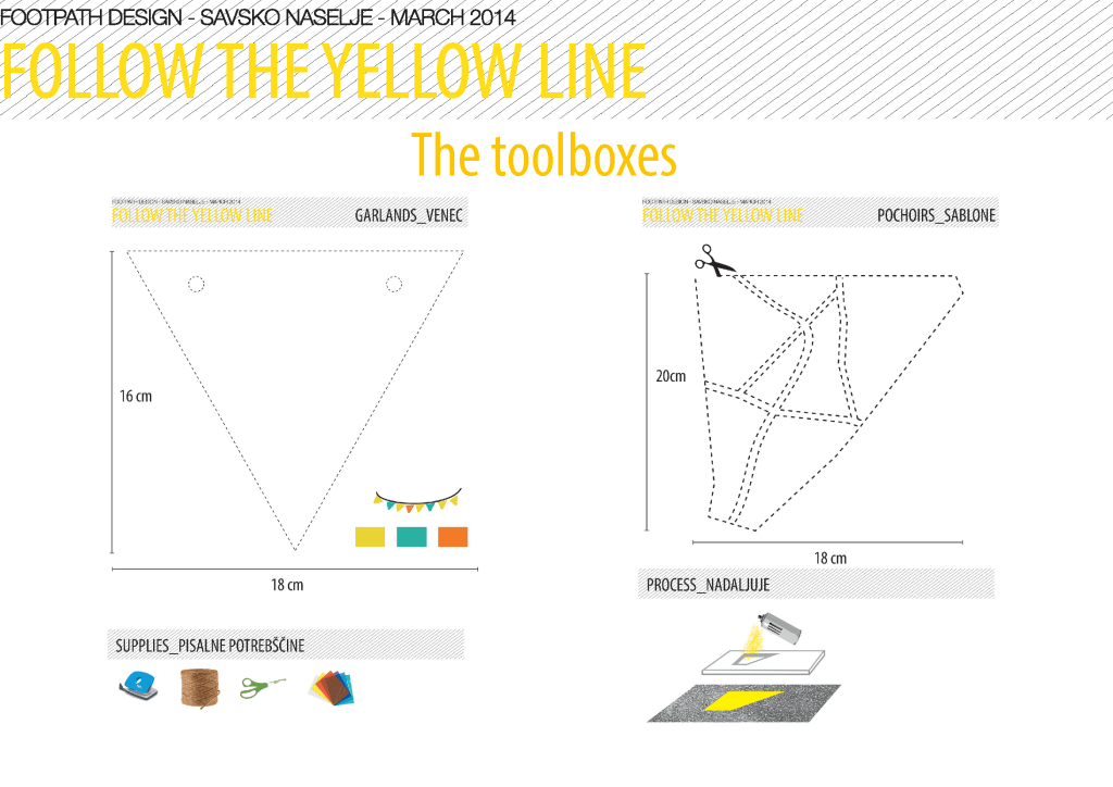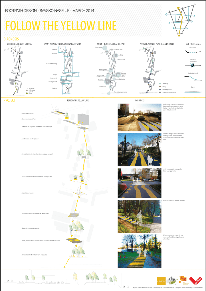 Les propositions d’aménagement temporaires ont été imaginés sur la base de la forme du quartier : un triangle et une grande ligne de traversée que nous avons souhaitée jaune : code couleur de l’association et du temporaire.